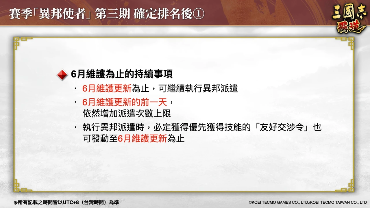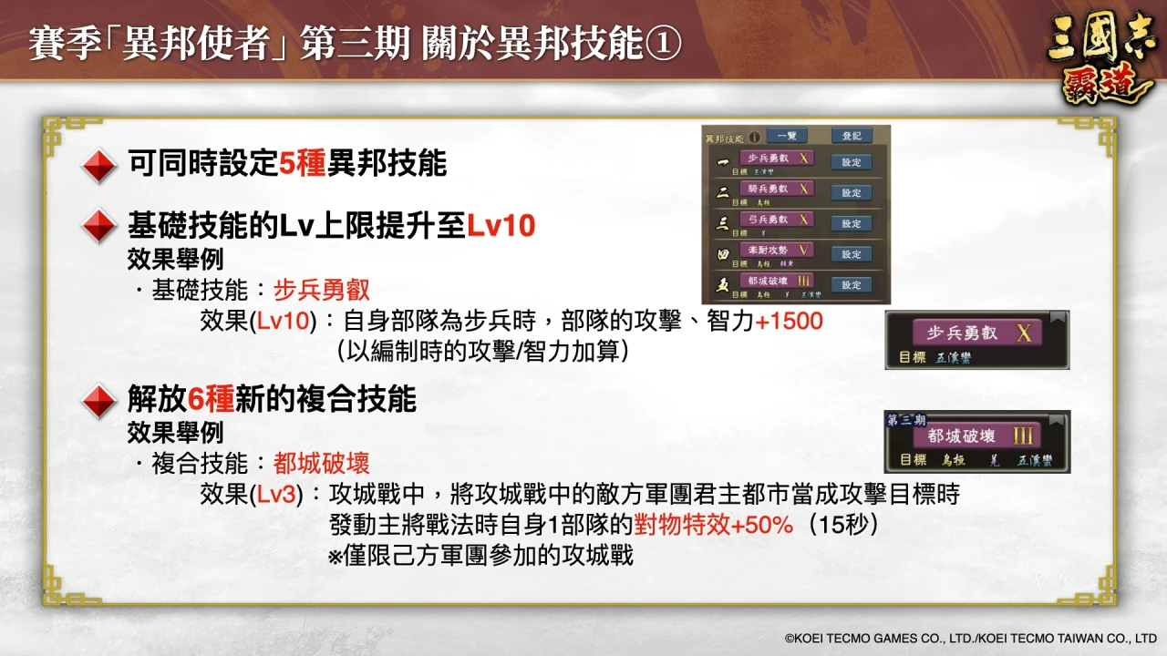 5月15日(四)新賽季「異邦使者」第三期開戰。除了將第一期登場的基礎技能的Lv上限開放至10之外,也可以同時設定最多5種異邦技能。此外,完成派遣3個派遣對象為解鎖條件並獲得強力效果的複合技能,將開放6種。使用新的複合技能以更前面的排名為目標吧。