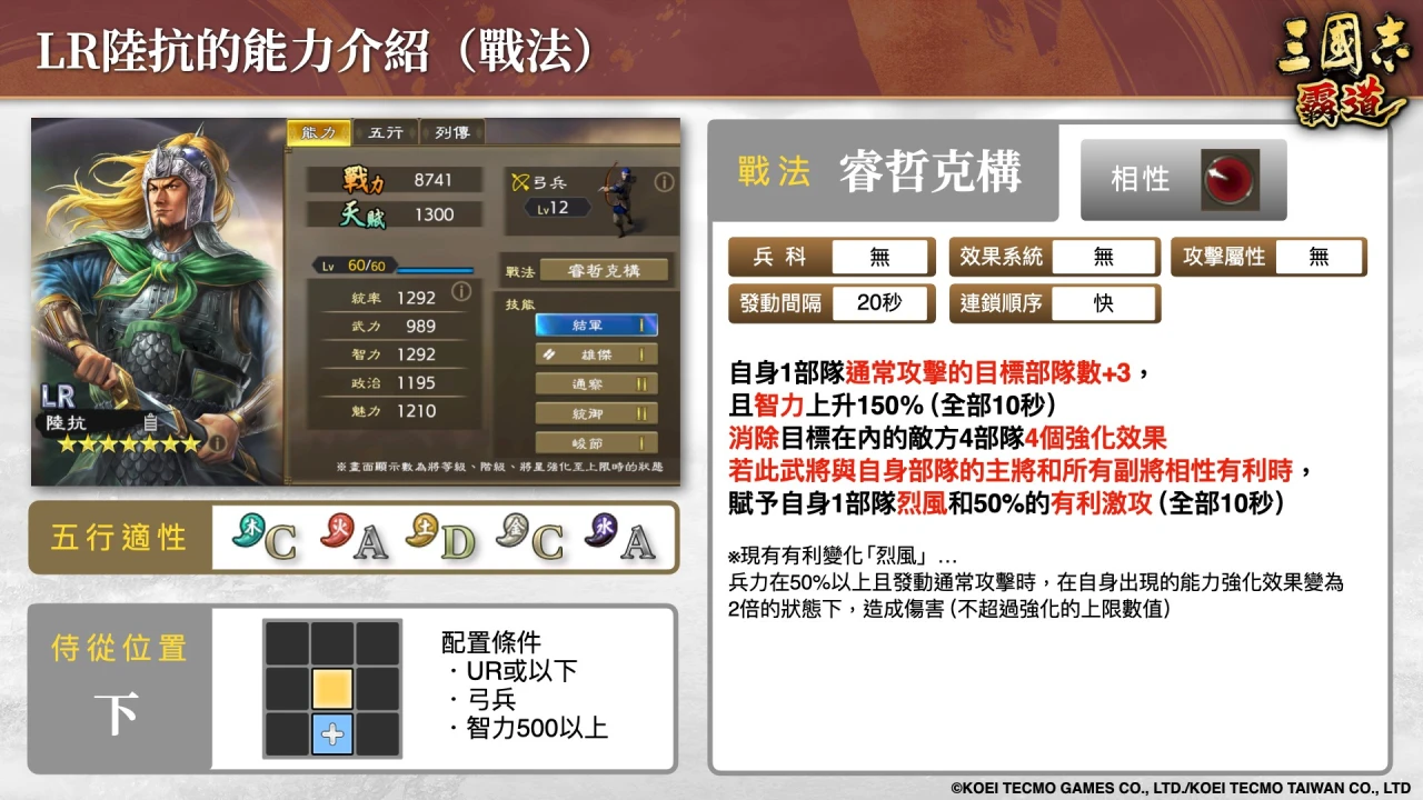 「LR陸抗」可以使用戰法賦予自身有利變化「烈風」和「有利激攻」,是有機會在通常攻擊產生大量傷害的武將。此外,技能「通察」在發動主將戰法時強化「會心發生」「會心威力」,是可以大幅提升部隊會心性能的弓兵武將。