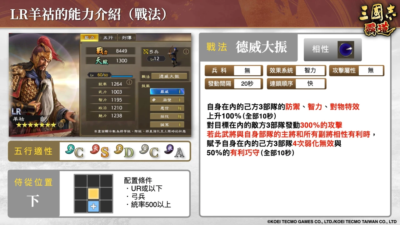「LR羊祜」是擁有使自己和我方的「對物特效」等上昇還可以進行戰法攻擊的武將。技能「恩信」可以在主將戰法發動時提昇「對物特效」,大幅提升自己和我方對物體造成傷害的弓兵武將。