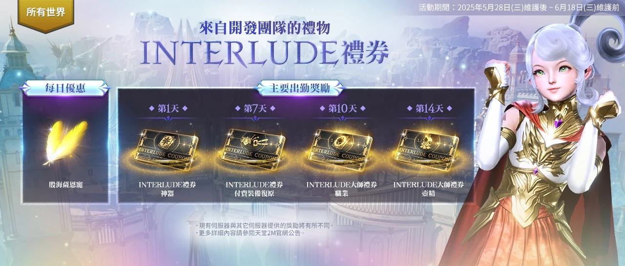 所有世界【INTERLUDE禮券】:5/28維護後~6/18維護前,活動期間內,透過每日優惠可獲得「殷海薩恩寵」以及「INTERLUDE禮券」。原始世界現有伺服器可獲得包含「付費裝備復原、大師職業、大師壺精、神器」共4張INTERLUDE禮券。法利昂與林德拜爾伺服器則可獲得包含「付費裝備復原、大師職業、大師壺精、神器變更」共4張INTERLUDE禮券。保值世界則可獲得「付費裝備復原、職業、壺精」共3張INTERLUDE禮券。