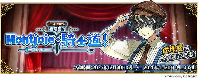 自2025年12月30日(二)維護後至2026年1月20日(二)12:59期間,已通關「特異點F 燃燒污染都市 冬木 第3節 進度1」的御主,登入遊戲即可獲得1張「CBC2025特別兌換券」;通關限時活動「CBC2025 查理曼的Montjoie.騎士道!」第1節後,於2026年1月27日(二)維護前,可透過「活動報酬」介面或是前往達.文西工房內的「活動道具兌換」,在9張「迦勒底男性精選2025」限時概念禮裝中,選擇喜歡的1張進行兌換。