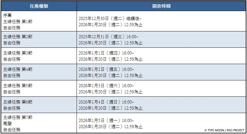 自2026年1月1日(四)00:00至2026年2月1日(日)23:59期間,主線任務第1部為止的AP消耗量降為0。
