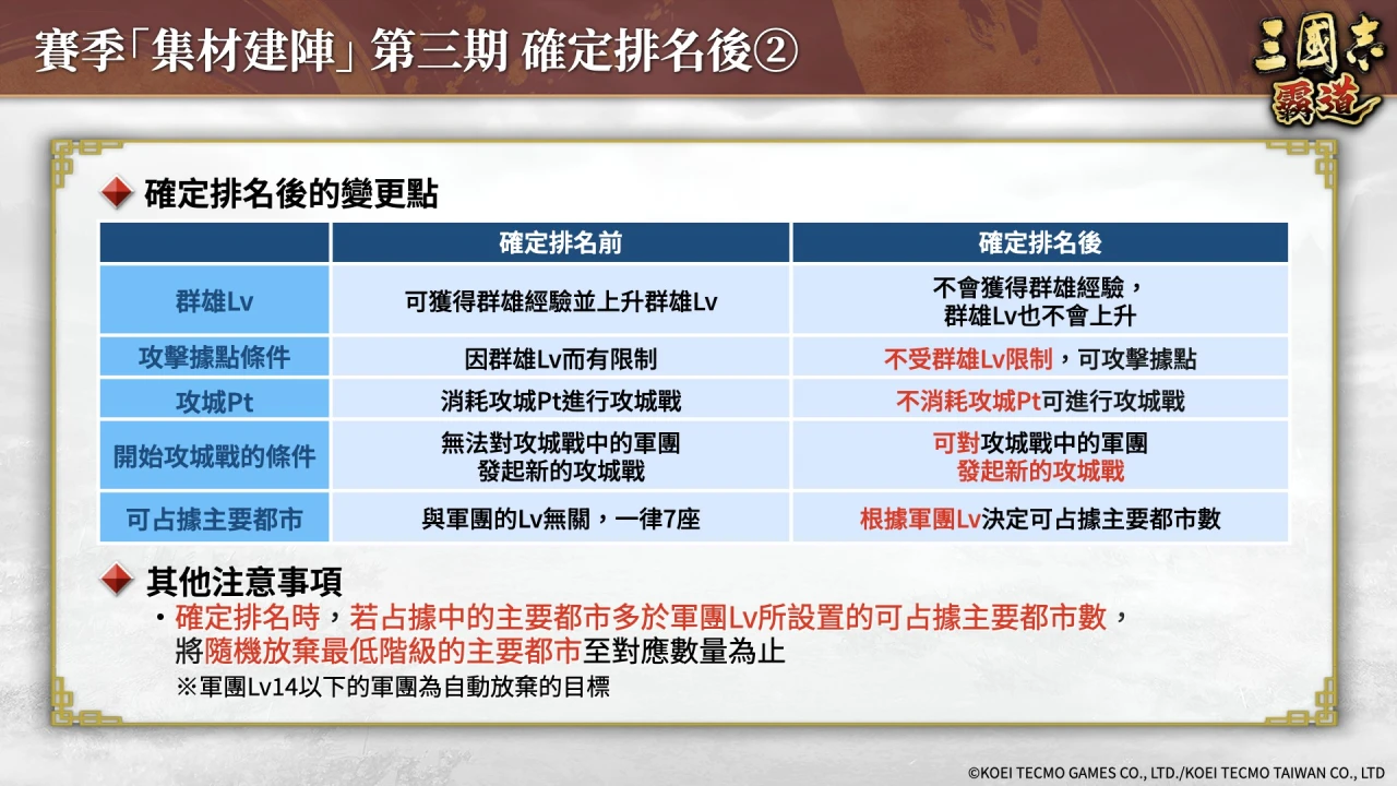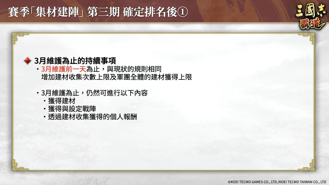 即日起,賽季「集材建陣」第三期開戰。強化「都市防護陣」及「祭壇防備陣」等5種戰陣,使用強力的戰陣在軍團間的爭奪中登上頂點吧。