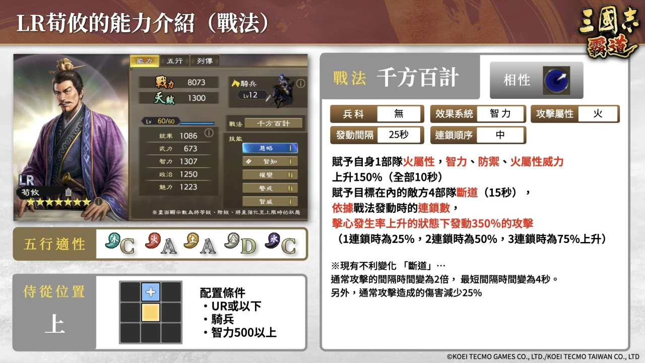 「LR荀攸」是根據戰法的連鎖數造成強力攻擊的騎兵武將。編制曹操/荀彧/郭嘉/程昱為主將時,該武將發動戰法時,提高擊心發生率及擊心威力的狀態下進行攻擊,是強化曹操部隊火力的最佳人選。