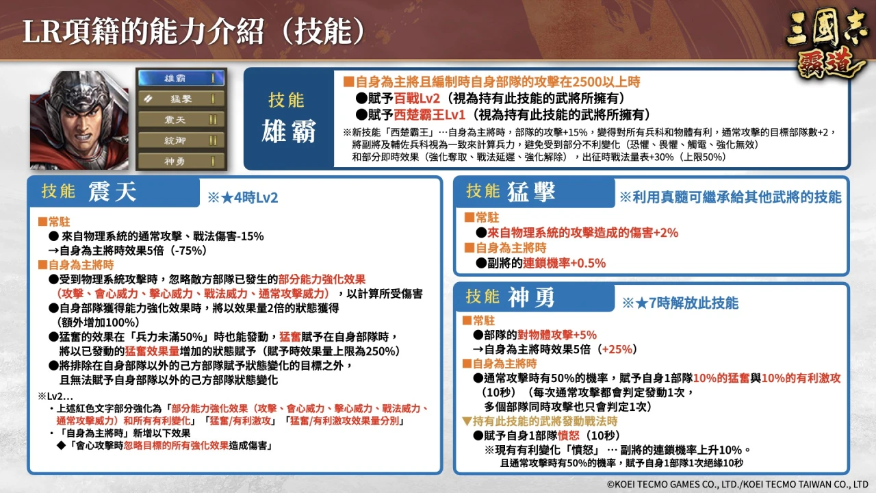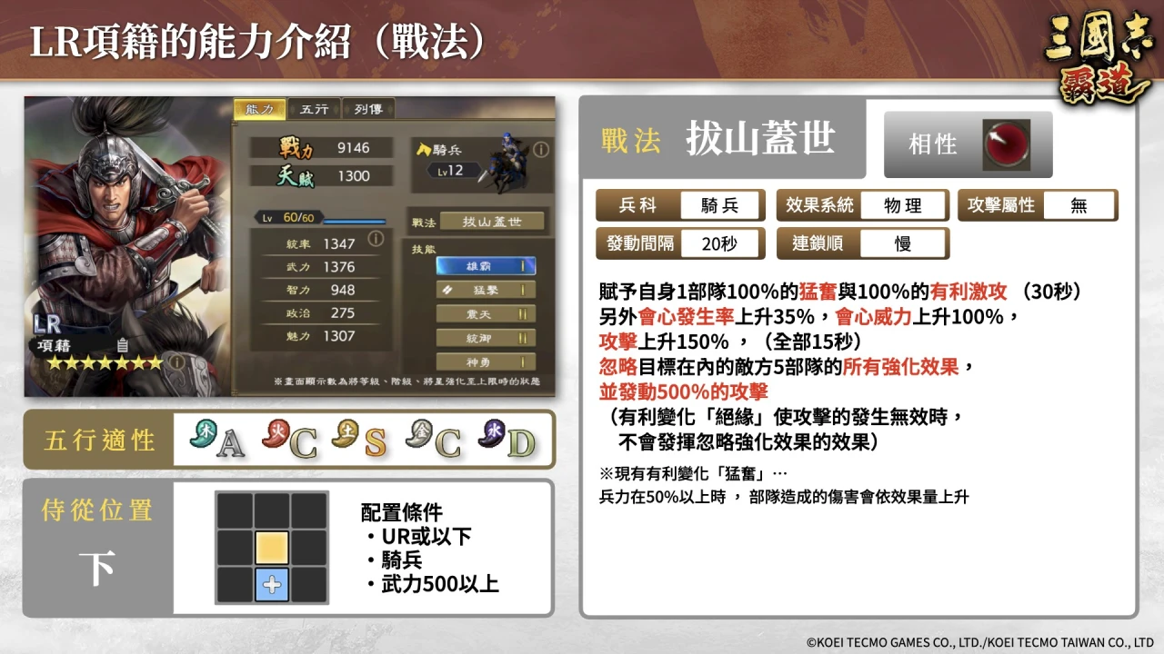 「LR項籍」擁有強力物理攻擊與物理抗性的騎兵武將。賦予高效果量的猛奮/有利激攻來造成強力的一擊。另外,大幅減輕物理系統造成的傷害,可堅持不懈地戰鬥。