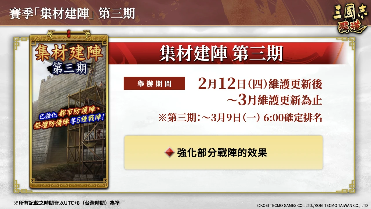 即日起,賽季「集材建陣」第三期開戰。強化「都市防護陣」及「祭壇防備陣」等5種戰陣,使用強力的戰陣在軍團間的爭奪中登上頂點吧。