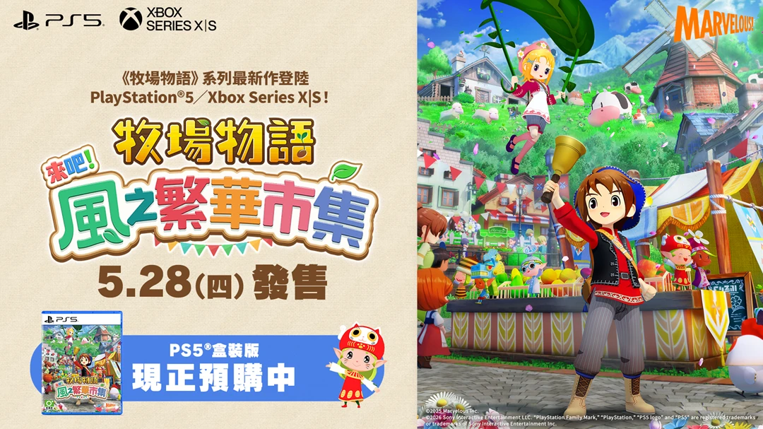 [2026年3月3日, 香港] Game Source Entertainment (GSE) 宣佈,由 Marvelous Inc. 開發及發行的溫馨生活遊戲《牧場物語》系列最新作品《牧場物語 來吧!風之繁華市集》將登陸 PlayStation®5 及 Xbox Series X|S 平台,並預定於5月28日(四)發售。PlayStation®5 盒裝版今天起正式接受預購,預購特典情報亦同步公開!